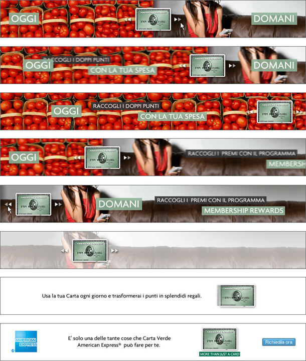 Banner campaign for the American Express Cashback Card. The campaign (which ran in Italy only) wanted to sugest clients that by using the card today (Oggi), on their everyday spendings, they could reap benefits tomorrow (Domani). There were several creative executions featuring on the left an everyday situation and on the right a potential reward.The banners were interactive, but if the user didn't touch them, they would eventually take over and play.