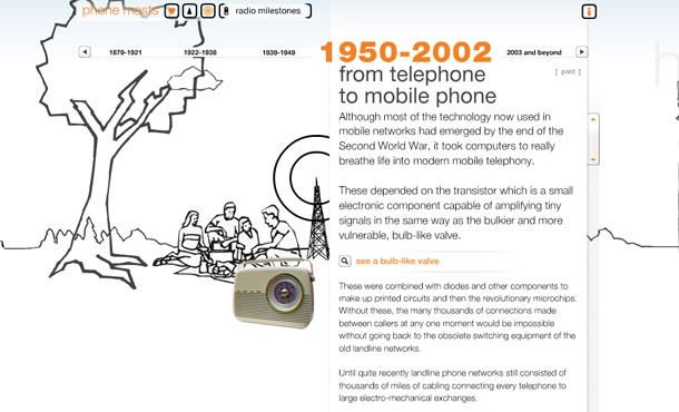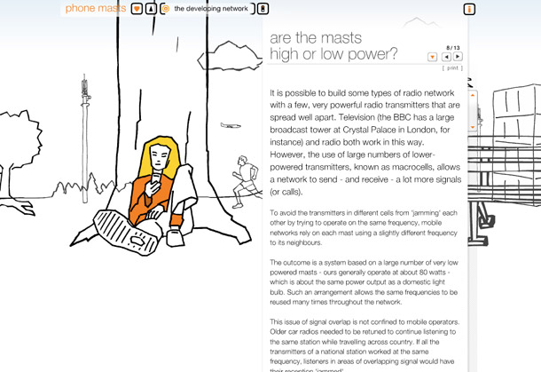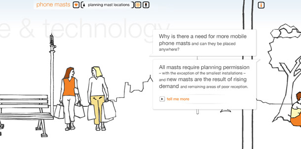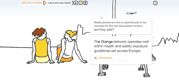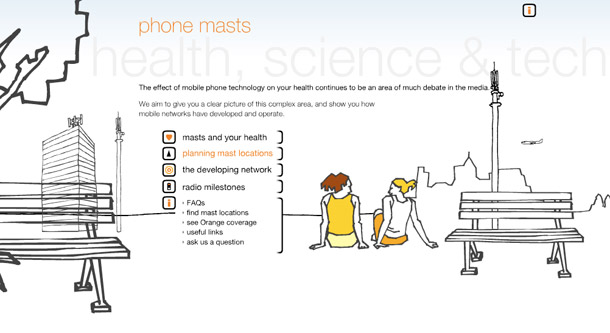 Orange had a section of their website the impact on health - or lack of it - of mobile phone masts. It focused on the science aspect of it and was written and laid out as an encyclopedia and so they wanted something that consumers could more easily understand. We created a website where we explain the facts and cientific concepts, in a simple yet scientifically correct way, with the help of visual aids embedded in side-scrolling a urban landscape.
