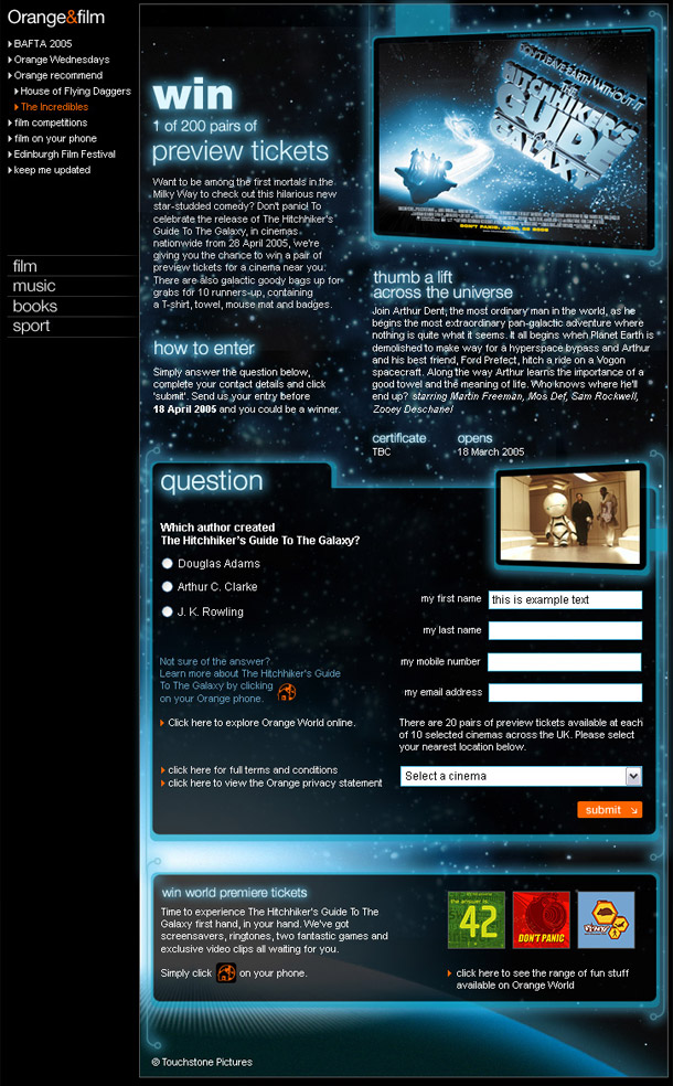 Forthnighly landing pages for the Orange Wednesdays promotion on Orange.co.uk. Shame on me I hardly kept any backups of these...