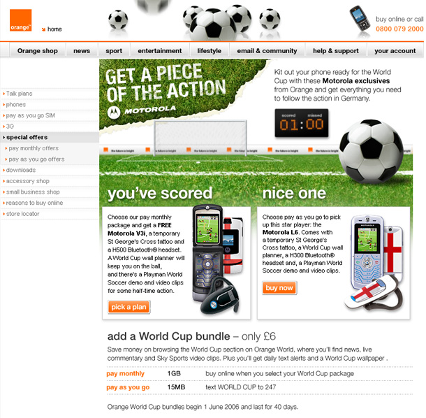 Orange wanted something special for their World Cup promotion - the biggest one of the year, apparently - but didn't want to pay more than a usual update... After all our ideas were cut down to simply a landing page on the website, I decided to include a small informal game/toy at the top of the page. I don't think the phones sold that much (probably down to the ugly phones and uninteresting merchandising that came with them), but at least in the office people played with it. For extended periods of time.