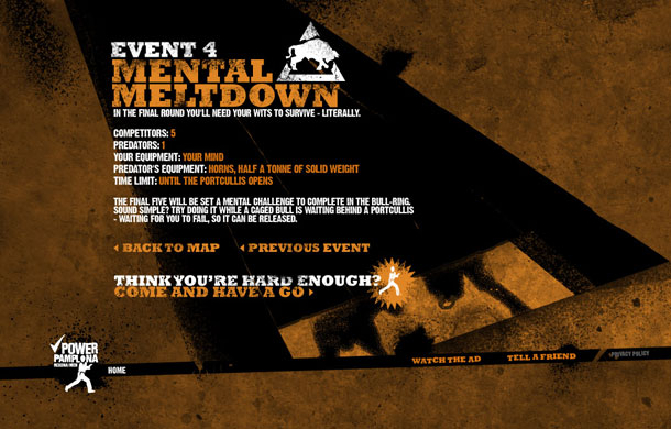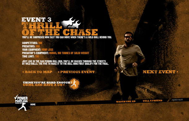 Rexona (Lynx in the UK) ran a campaign inspired by the Pamplona bull run, where a man was chased not only by bulls, but bears, lions and angry husbands. To tie in with the campaign they divised a PR event - a competition held in Pamplona in Takeshi Castle style, where one hunderd competitors would run through the streets of Pamplona, while being chased by mercenaries armed with laser guns. With a very limite budget and only two weeks, we shot some runners over a green screen, included them as loops in the layouts, created fullscreen video cutscenes and developed a dynamic website that was displayed in 7 languages.